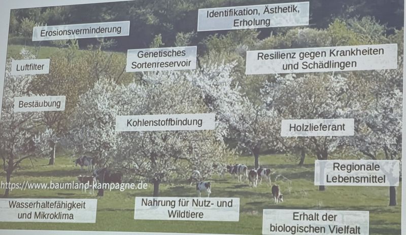 Zu unserer und zur Streuobstwiese im Allgemeinen hatte Herr Jürgen Schlicht anschließend noch einige Anmerkungen. So weist er auf die Sortenvielfalt Obst und auf die gesamte Vielfalt der Flora (Pflanzen, Gräser usw.) und Fauna (Insekten, Vögel usw. hin. Aber, es sind auch weitere positive Merkmale zu erkennen. So ist der Erosionsabbau vermindert, die Kohlenstoffbindung ist hoch und vieles mehr.
