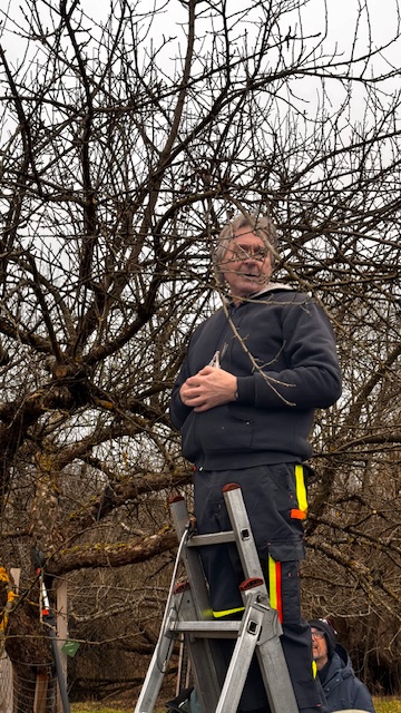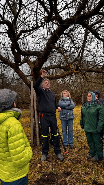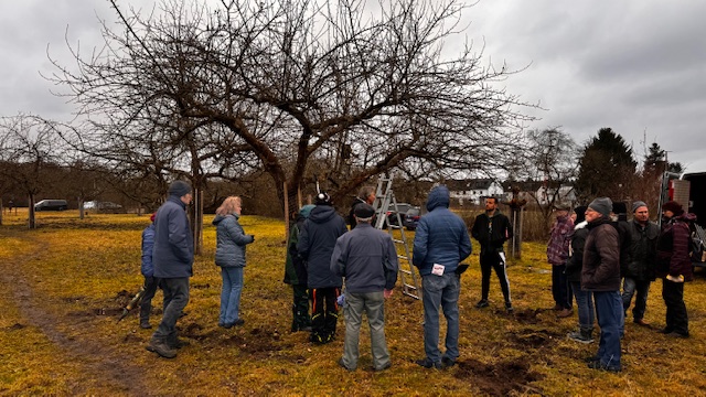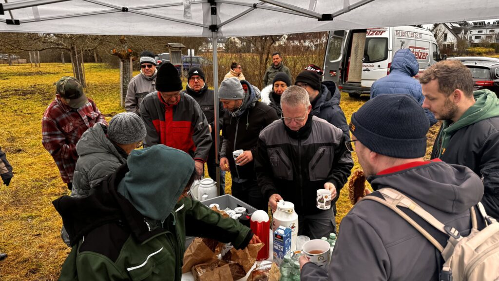 Für unseren Obstbaum-Schnittkurs hatten wir am 15.02.2025 nicht die besten Wetter-Voraussetzungen, so ließ der Organisator der Veranstaltung „Manfred Maier“ für alle Fälle ein Pavillon als Unterstand aufgebaut.
